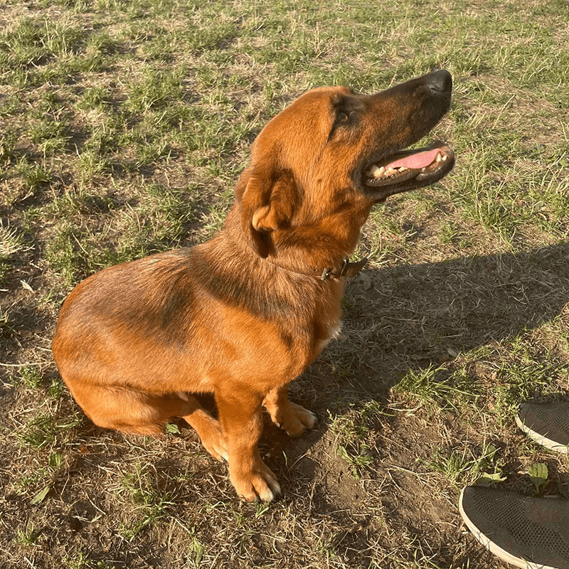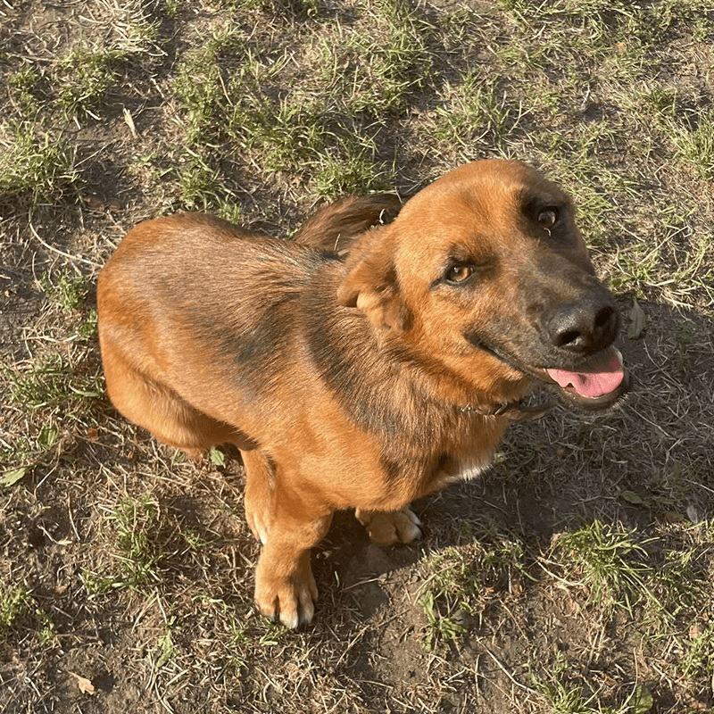 Muffin egy 9 hónapos, ivartalanított kan kutyus, tacskó–németjuhász jellegű keverék. Mostani mérete már végleges, nem fog nagyobbra nőni.